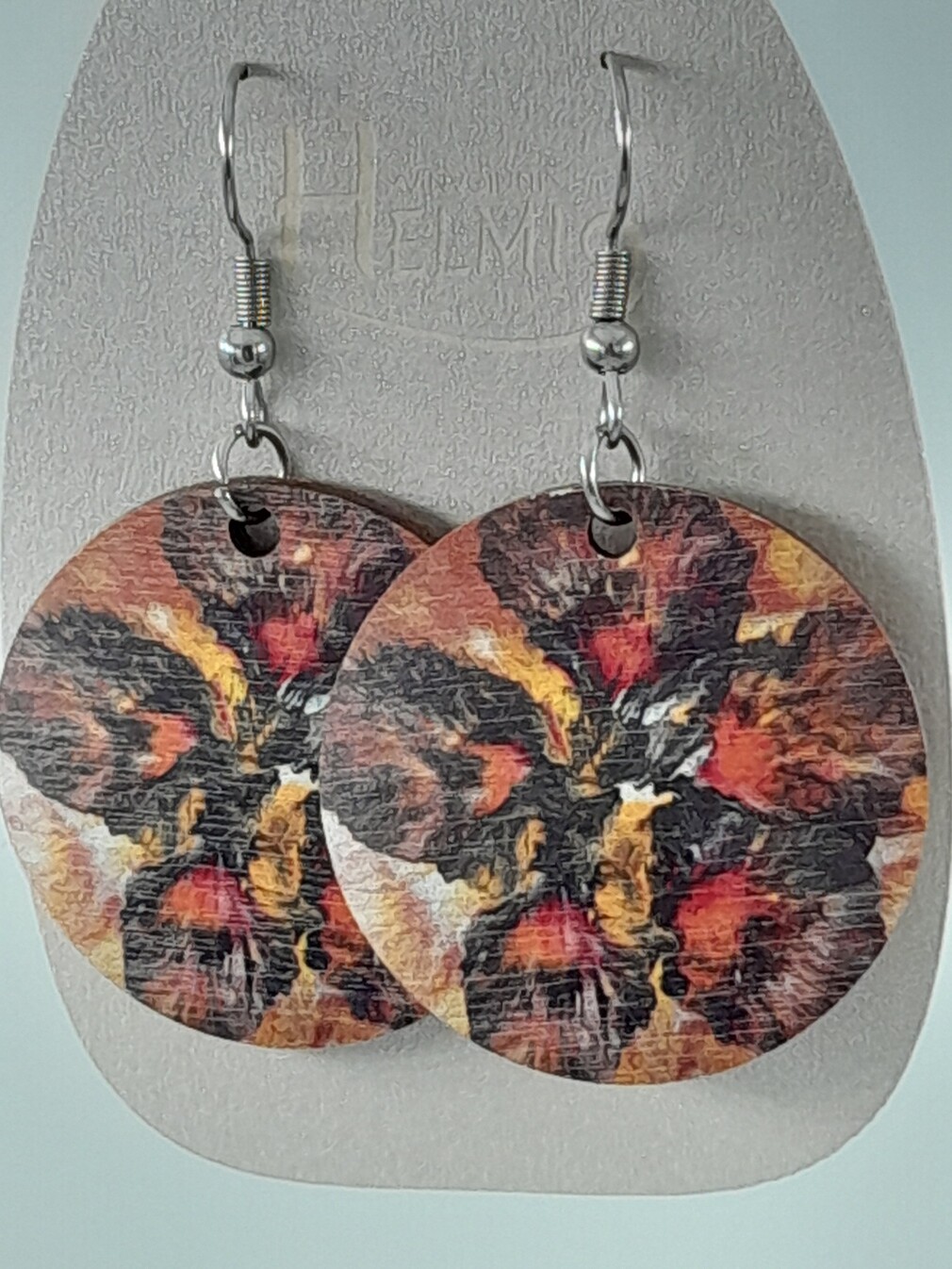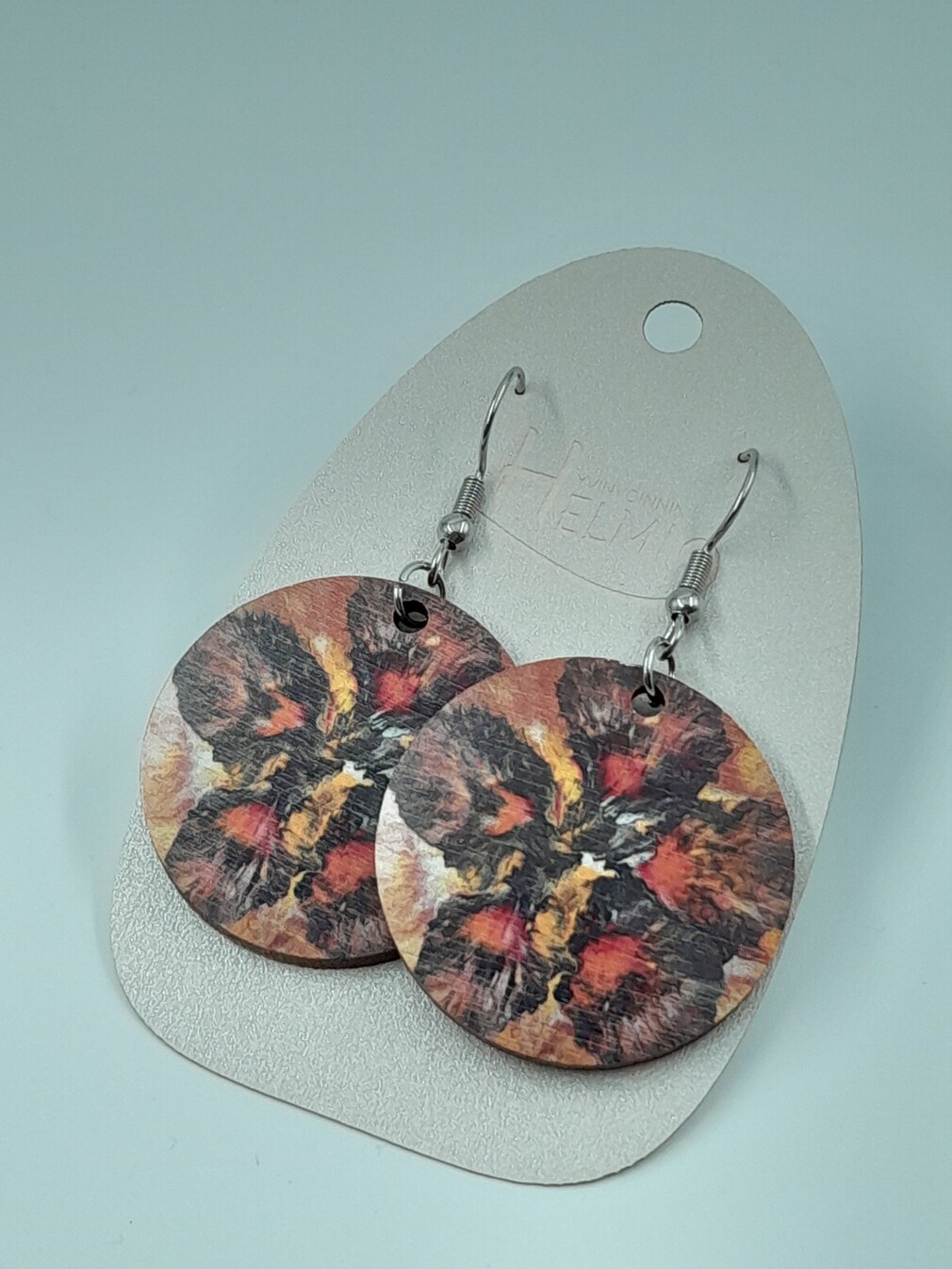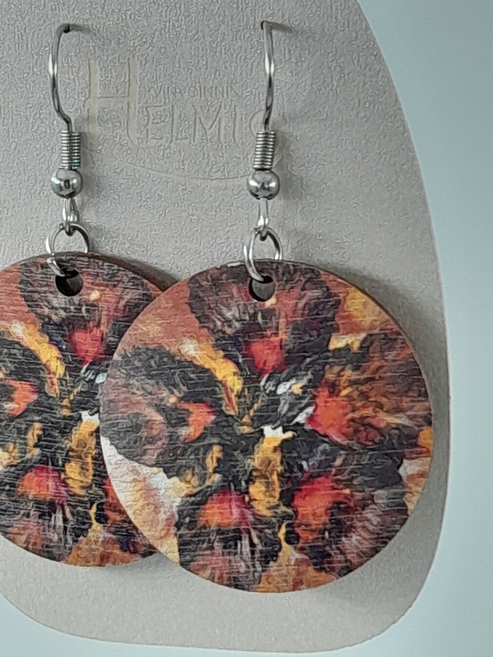 Taidekorvakorut ovat käsityönä Suomessa valmistettuja ja kuva on peräisin aidosta”Feeniks” akryylimaalauksestani. Kuva on painettu korun molemmille puolille, joten ne näyttävät aina hyviltä riippumatta mistä suunnasta niitä katsoo. Koivuvaneri on ohut (2mm) ja erittäin kevyt materiaali, joten korvakorut ovat ihanan kevyet pitää. Korvakorujen koukut ovat allergiavapaata kirurginterästä RST L316 (Suomessa testattu).